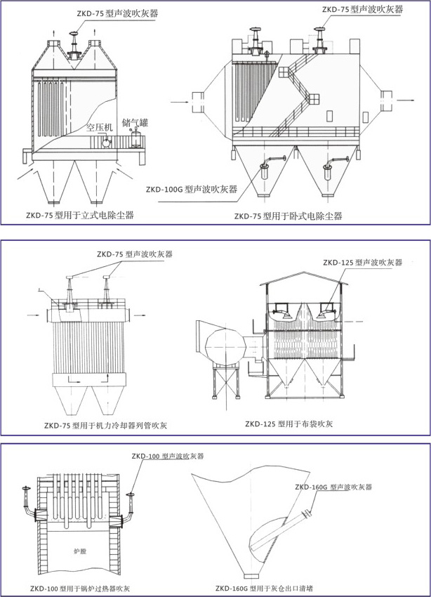聲波吹灰器由發(fā)聲器,擴(kuò)聲筒,氣路控制系統(tǒng)及電控單元組成,適用于鍋爐受熱面,SCR系統(tǒng),ESP除塵器等部位的清灰。而且,聲波吹灰器也用于布袋除塵器,旋風(fēng)除塵器,料倉,管道等易形成粉塵堆積,粘掛,流通不暢的場(chǎng)合。
